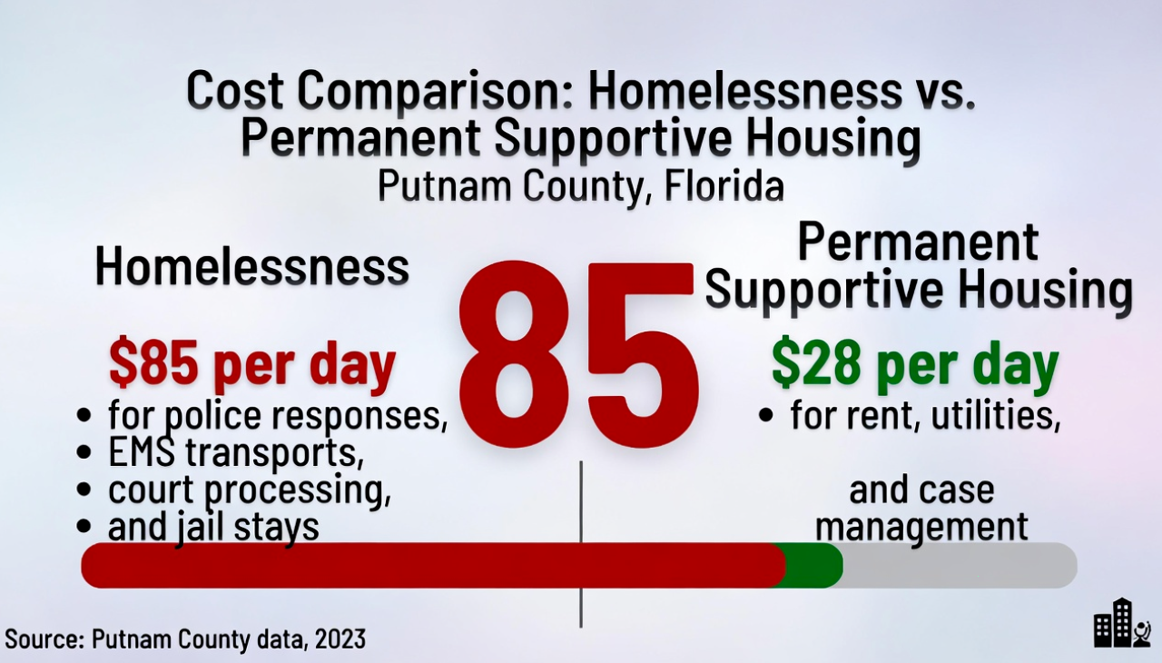 • Emergency Services: A single ER visit for a preventable condition costs thousands—often absorbed by the taxpayer or the hospital. Nationally and in Florida communities, chronic homelessness drives frequent crisis use, with unhoused individuals costing taxpayers $30,000–$50,000+ per person per year in emergency healthcare, law enforcement, and related services.